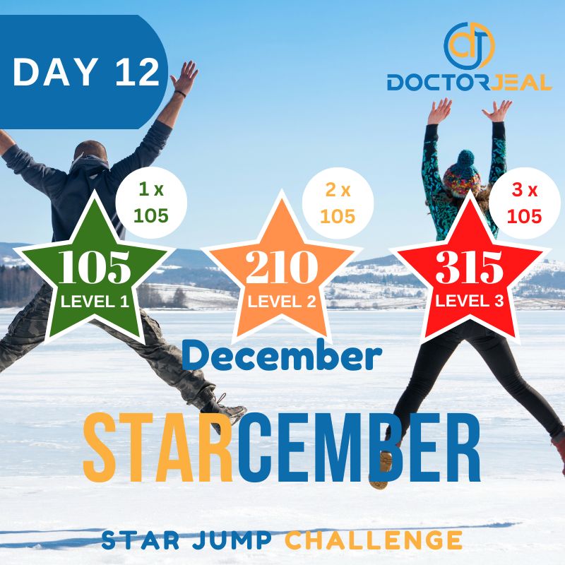 41.8K Table of Contents The Star Jump (Jumping Jack)Joining in ChecklistTarget GuideScoring the ChallengeDecember Starcember StarJump Exercise Challenge Scoring Sheet 73.36 KB 20 downloadsExercise Challenge DesignHalf Star Jump1 x BONUS POINTSStar Jumps (Jumping Jacks)2 x BONUS POINTSExplosive Star Jumps3 x BONUS POINTSHow to up the intensity Starcember Star Jump Challenge Targets Day 12 Starcember Exercise Challenge Day 12 Day 12 of the #Starcember Star Jump Challenge with 105,210 or 315 Star Jumps. Stressed? Take it out on some jumping jacks before you leave the house. 🟢 Level 1 = 105 Star Jumps (1 set of 105) 🟠 Level 2 = 210 Star Jumps (2 sets of 105) 🔴 Level 3 = 315 Star Jumps (3 sets of 105) Get your daily challenge target in your inbox, sign up at https://doctorjeal.com/december-star-jump-exercise-challenge-starcember/ Get full info on the Star Jump challenge Share this: Share on Facebook (Opens in new window) Facebook Share on X (Opens in new window) X Share on LinkedIn (Opens in new window) LinkedIn Share on WhatsApp (Opens in new window) WhatsApp Share on Pinterest (Opens in new window) Pinterest Share on Reddit (Opens in new window) Reddit More Email a link to a friend (Opens in new window) Email Like this:Like Loading... Pages: 1 2 3 4 5 6 7 8 9 10 11 12 13 14 15 16 17 18 19 20 21 22 23 24 25 26 27 28 29 30 31 32 December Challengeexercise challengejumping jackMonthly Challengestar jumpstarcemberworkout 0 comments 0 FacebookTwitterPinterestLinkedinTumblrRedditStumbleuponWhatsappEmail doctorjeal I’m a fitness and business expert, passionate about health and fitness and helping people get more active. I’ve built many fitness challenges and workouts. I love waking, getting outside, and gardening. previous post November Lunge Exercise Challenge (Lungevember) next post January Plank Challenge (PlankAwayJanuary) You may also like August Squat Thrust Exercise Challenge (AugThrust) July 27, 2018 July NO Alcohol Challenge (Dry July) June 11, 2018 June Stepping Exercise Challenge (StepItUpJune) May 7, 2018 Spotty Dog May Exercise Challenge April 1, 2018 April Abs Exercise Challenge March 2, 2018 March Push Up Exercise Challenge (MarchUp) February 20, 2018 February FEBURPEE BURPEE Challenge January 2, 2018 January Plank Challenge (PlankAwayJanuary) November 30, 2017 November Lunge Exercise Challenge (Lungevember) October 4, 2017 October Squat Exercise Challenge (Squatober) September 28, 2017 Leave a ReplyCancel reply This site uses Akismet to reduce spam. Learn how your comment data is processed.