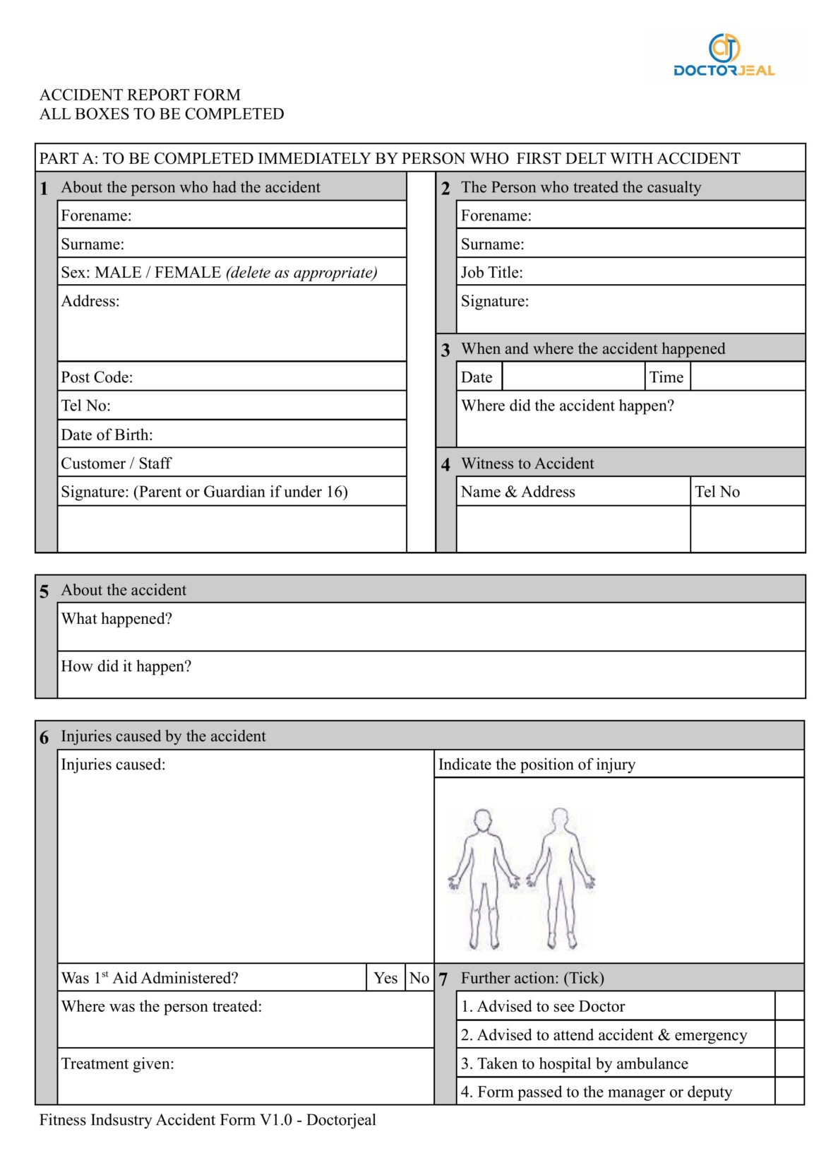 An accident report form template for use by fitness business, branded with DoctorJeal logo, see unbranded version or Google docs version to edit your own form.