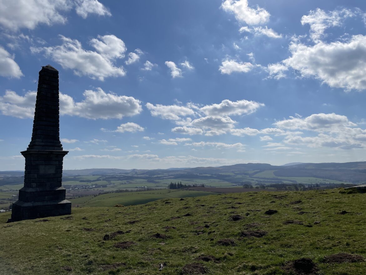 Follow the track uphill and you will be greeted with a glimpse of the Monument sitting on top of Kildoon Hill, your destination clear to see.